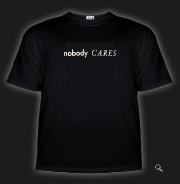 As I stated earlier, this is the only place that you can buy these. If they are being sold elsewhere, the money is not going to the right place. Therefore, do not buy knockoff nobody shirts (just in case some jerk tries to sell knockoff nobody shirts.) To add a sense of rarity, and therefore urgency to buy, each round of 96 shirts will only be produced once. The first round will be "nobody CARES". After they sell out, we will post the next two types of shirts that will be available. We will eventually expand to women's, kid's, hats, jackets, and whatever else we feel nobody needs to be involved with.